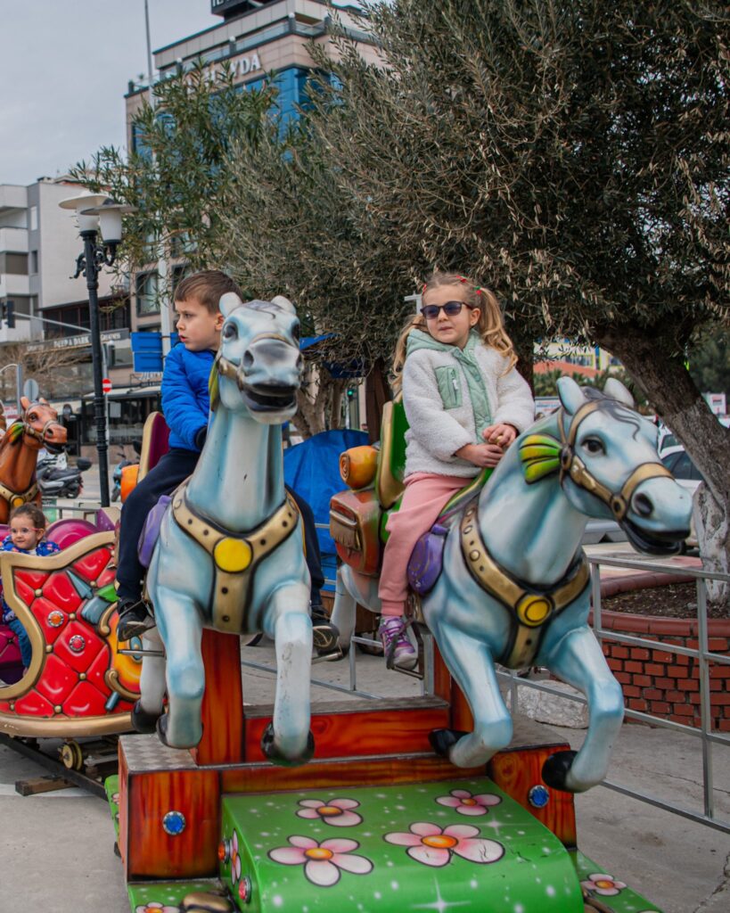 Kuşadası’ndaki öğrenciler, 15 günlük sömestr tatilinin keyfini Kuşadası Belediyesi tarafından İsmail Cem Dostluk ve Barış Meydanı’na kurulan oyun alanında çıkarıyor. Yoğun okul programından biraz olsun uzaklaşıp dinlenmek isteyen öğrenciler, ebeveynleriyle birlikte alana gelerek lunapark eğlencesinin tadını çıkarıyor. Oyun alanında çocuklar tarafından en çok rağbet gören oyuncaklar ise gondol ve atlıkarınca oluyor. Öğrencilerin sosyalleşmesini de sağlayan oyun alanı, 15 Şubat 2023 tarihine kadar hafta içi 12.00-18.00, hafta sonu ise 11.00-19.00 saatleri arasında ücretsiz olarak ziyaret edilebilecek.