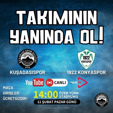 Kuşadasıspor’un pazar günü evinde oynayacağı müsabaka saat 14.00’te başlayacak. Özer Türk Stadyumu’nda gerçekleşecek olan karşılaşmaya tüm spor severler davetli. Kulüp tarafından yapılan açıklamada, maçın ücretsiz olarak izlenebileceği belirtildi.
