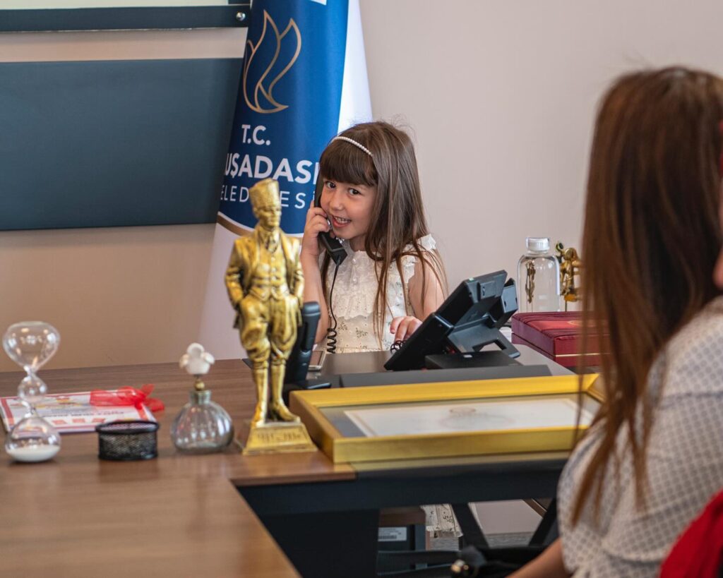 Kuşadası Belediyesi, 23 Nisan Ulusal Egemenlik ve Çocuk Bayramı’nı coşkuyla kutluyor. Bu özel günde, Kuşadası Belediye Başkanlığı makamını minik ziyaretçilere devrederek çocukların hayallerini gerçekleştirdi.